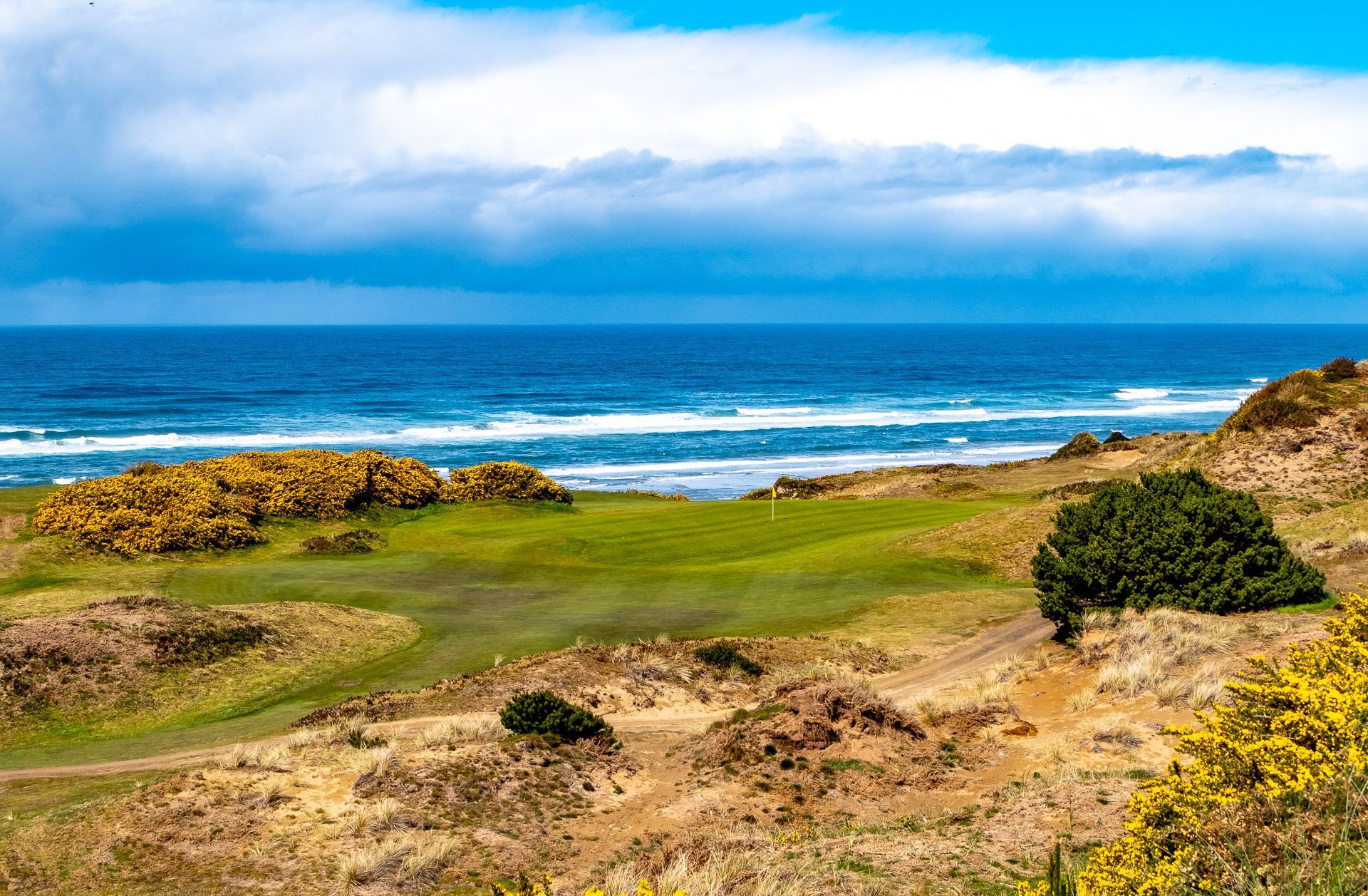 Standing on the first tee at Bandon Dunes, you are quite oblivious to all the marvelous trouble that awaits. The ocean is hidden from view, somewhere off to your left behind the sand dunes and shrubs and hotels that bowl the opening fairway. You are also just a few steps from the main lodge, where you can see the other guests smiling around the gas fire pit that burns 24-7. They seem so safe and calm.