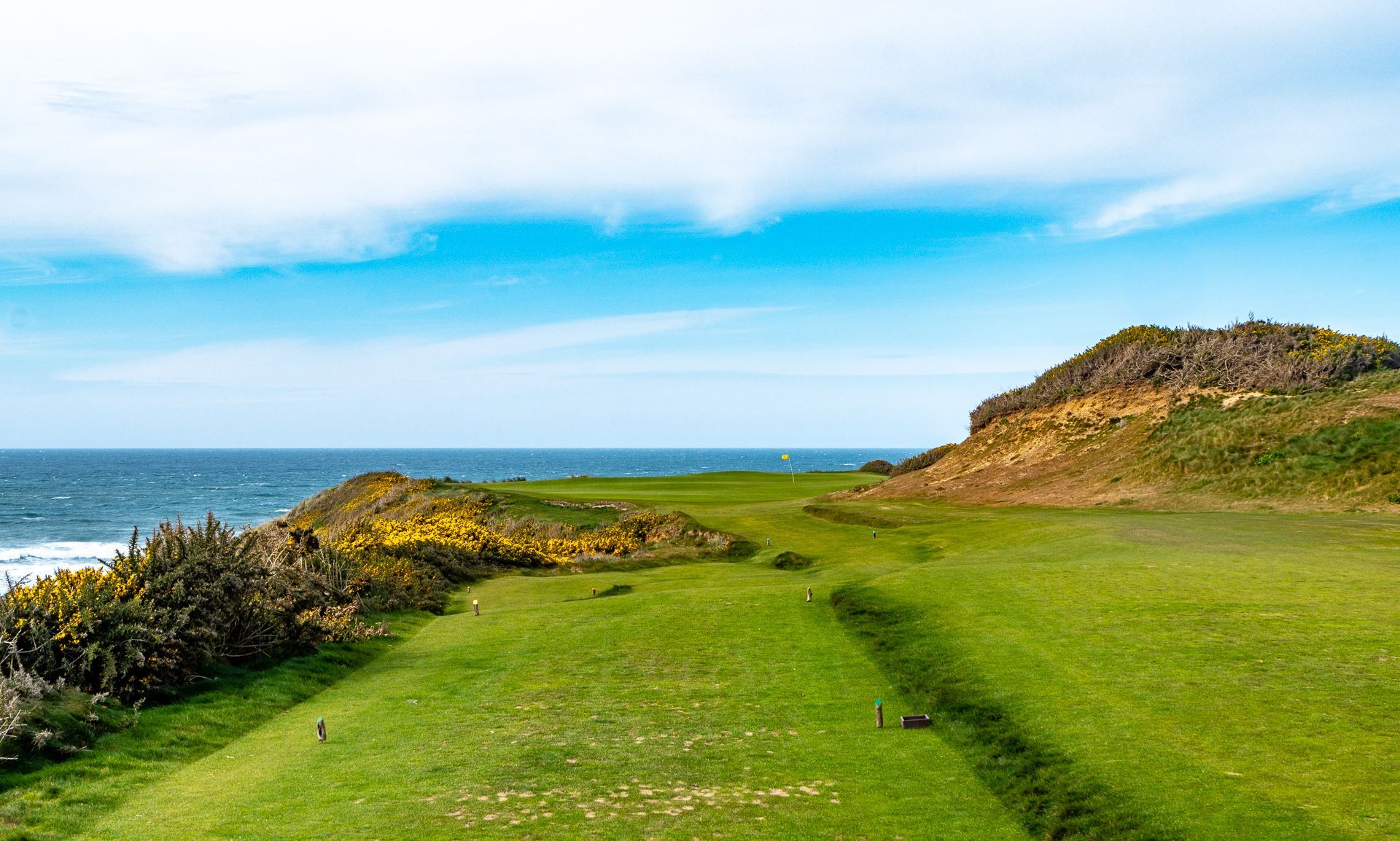 Thankfully he didn’t notice the ball marks on the shaft, and I was already too intimidated to ask him, “centre-left of what?” All I saw were some shrubs to the right and left of a short fairway which quickly disappeared before a hill, leaving nothing for the eyes to focus on but a particular white-capped wave moving angrily across the sea.